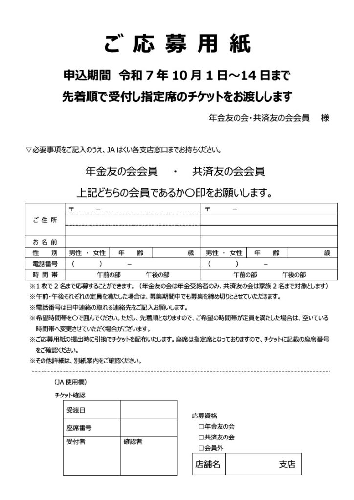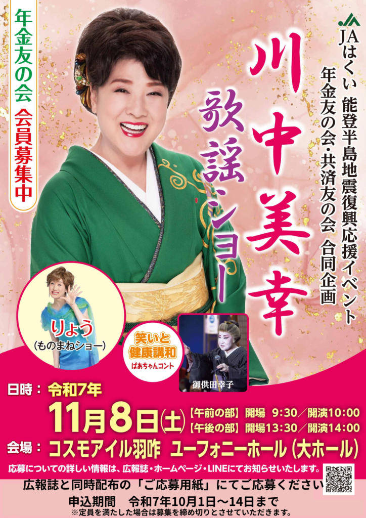 令和7年JAはくい能登半島地震 復興応援イベント年金友の会・共済友の会合同企画「川中美幸歌謡ショー」を11月8日(土)、コスモアイル羽咋で開催いたします。JAはくい年金友の会・共済友の会の会員の方が対象です。先着順で定員を満たした場合は、応募決め切りとなります。